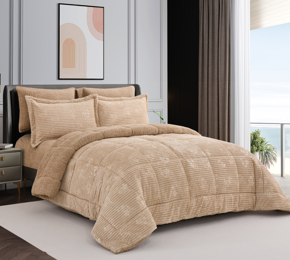 This comforter set brings a luxurious feel to your space with its beautifully embossed jacquard design and soothing beige tone. The plush flannel fabric provides gentle warmth, making it ideal for cooler nights, while the subtle sheen adds a touch of classic charm. Designed to blend effortlessly with any décor, it enhances both modern and timeless bedroom styles.